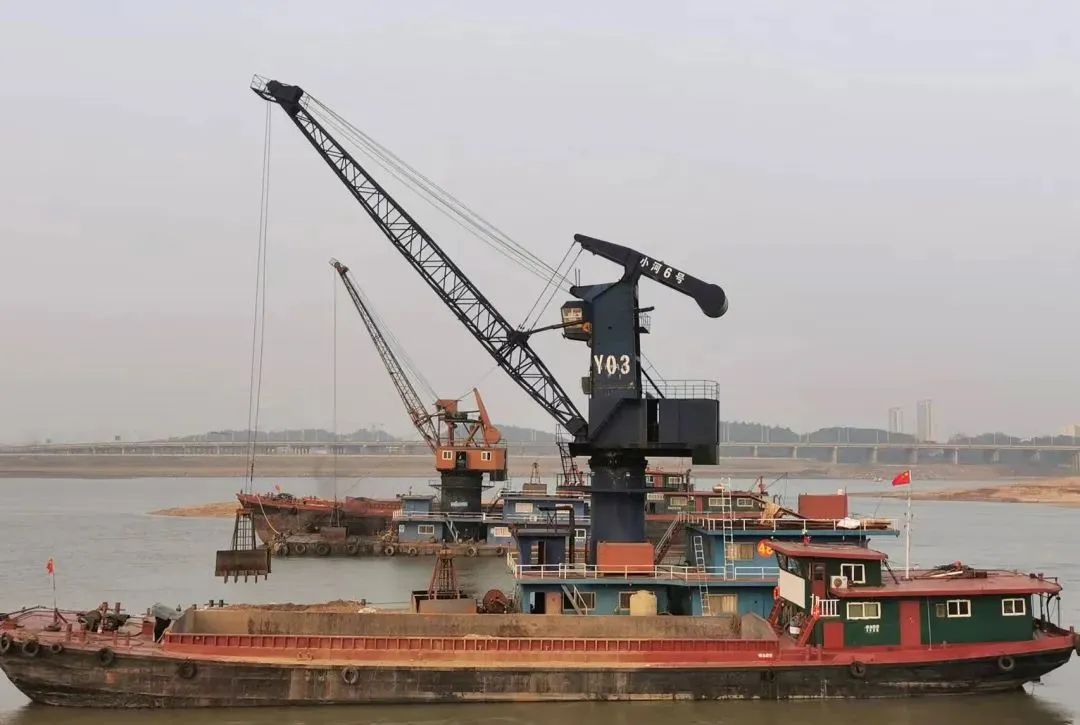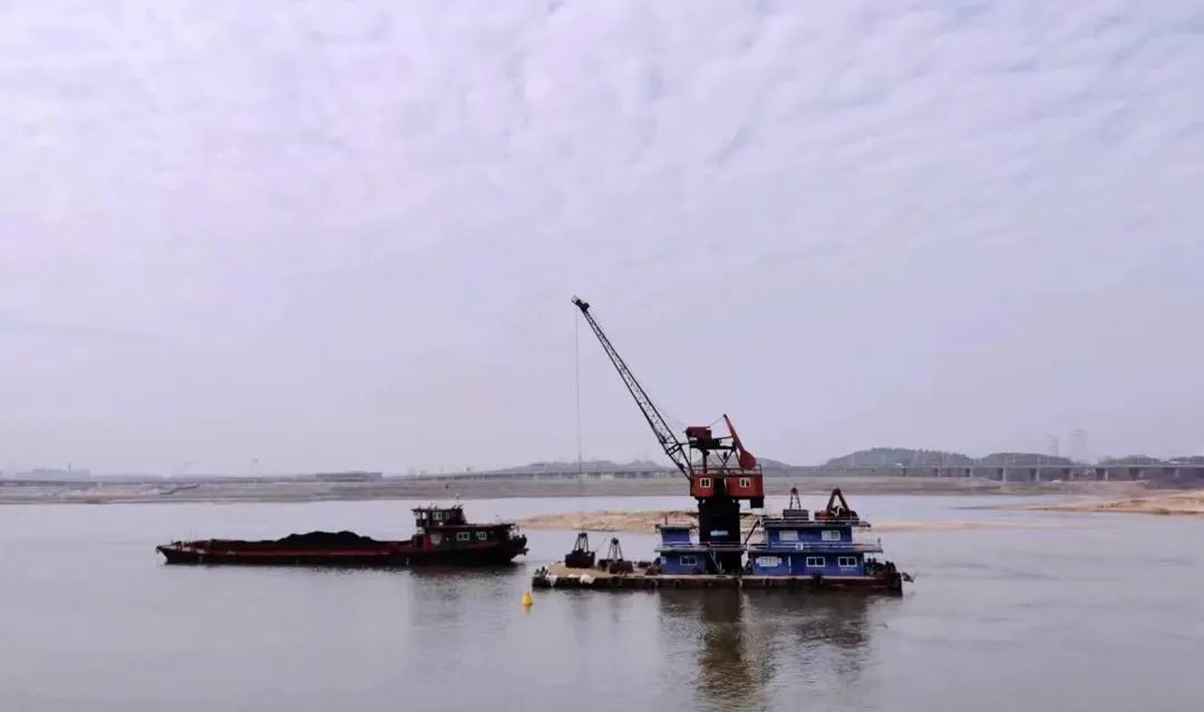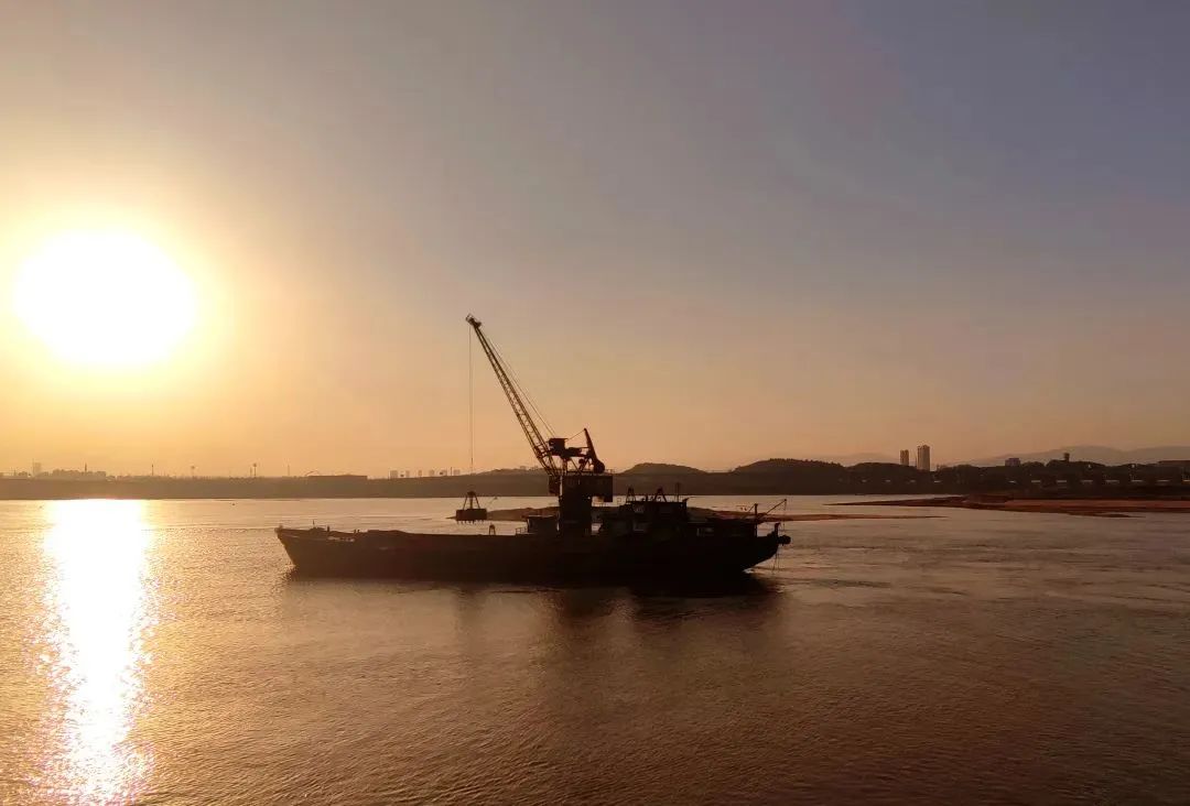 12月14日下午16时,夕阳余晖洒满江面,赣江主支英雄大桥下游1000米处一艘货运船正停泊在江心位置,紧挨着的水上浮吊正在有条不紊的作业,它的大臂有节奏地来回摆动着,伴随着“轰隆轰隆”的机械运转声,底端的抓斗将一袋袋从江里抓起的砂石放进货运船舱,然后又返回河道抓取砂袋……此时,正对着船只的堤岸上一双疲惫的眼睛始终聚精会神地注视着这里,水上浮吊大臂摆动的频率正牵动着他的心。